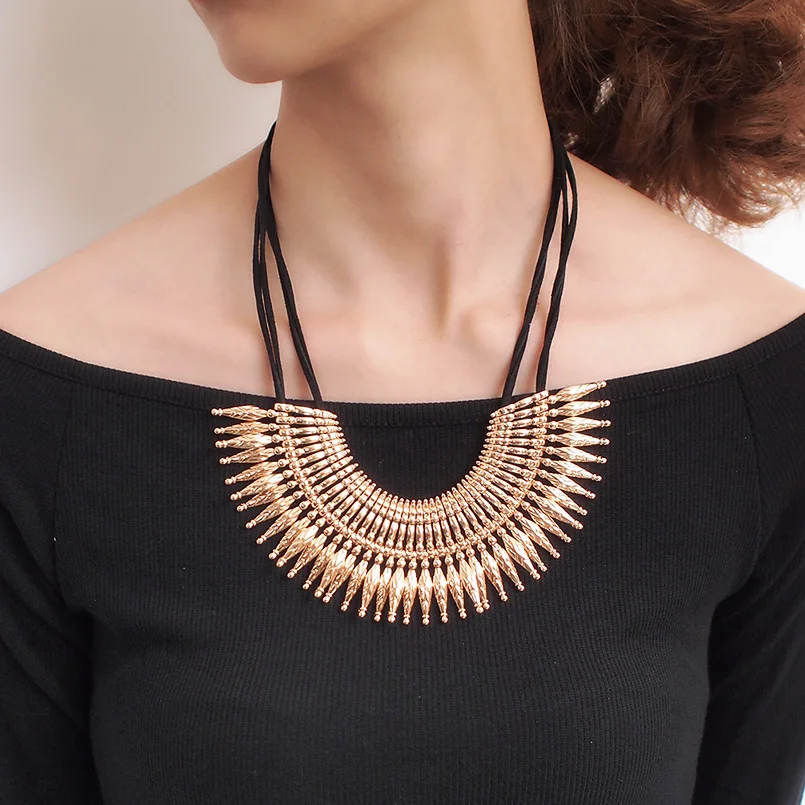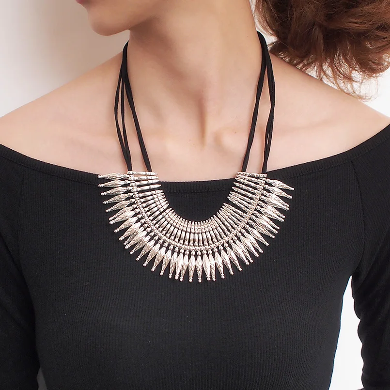 TOP Fashion Black Leather Metal Pendants Necklaces Women Bib Collar Simple Layered Choker Necklace Maxi